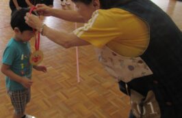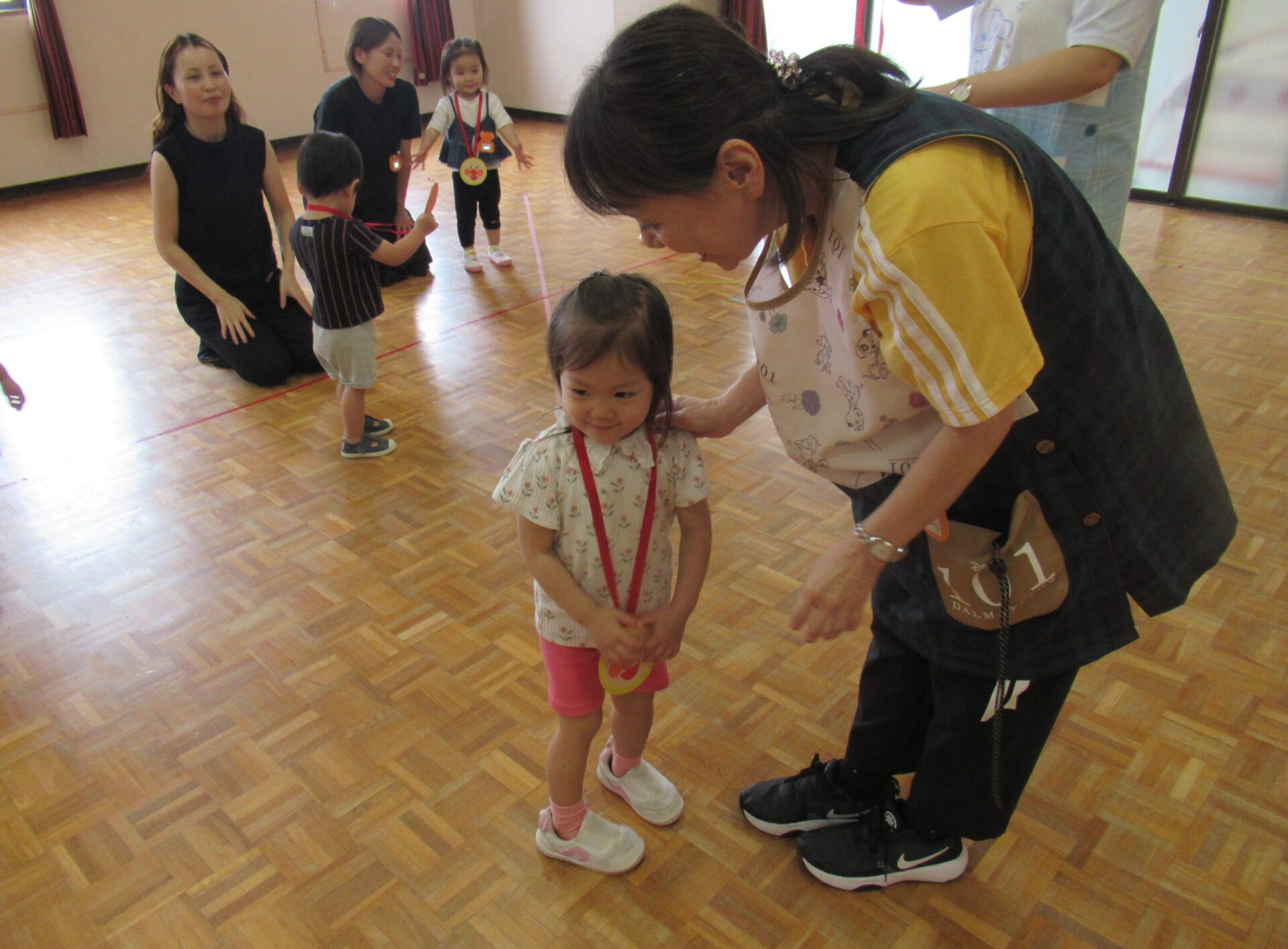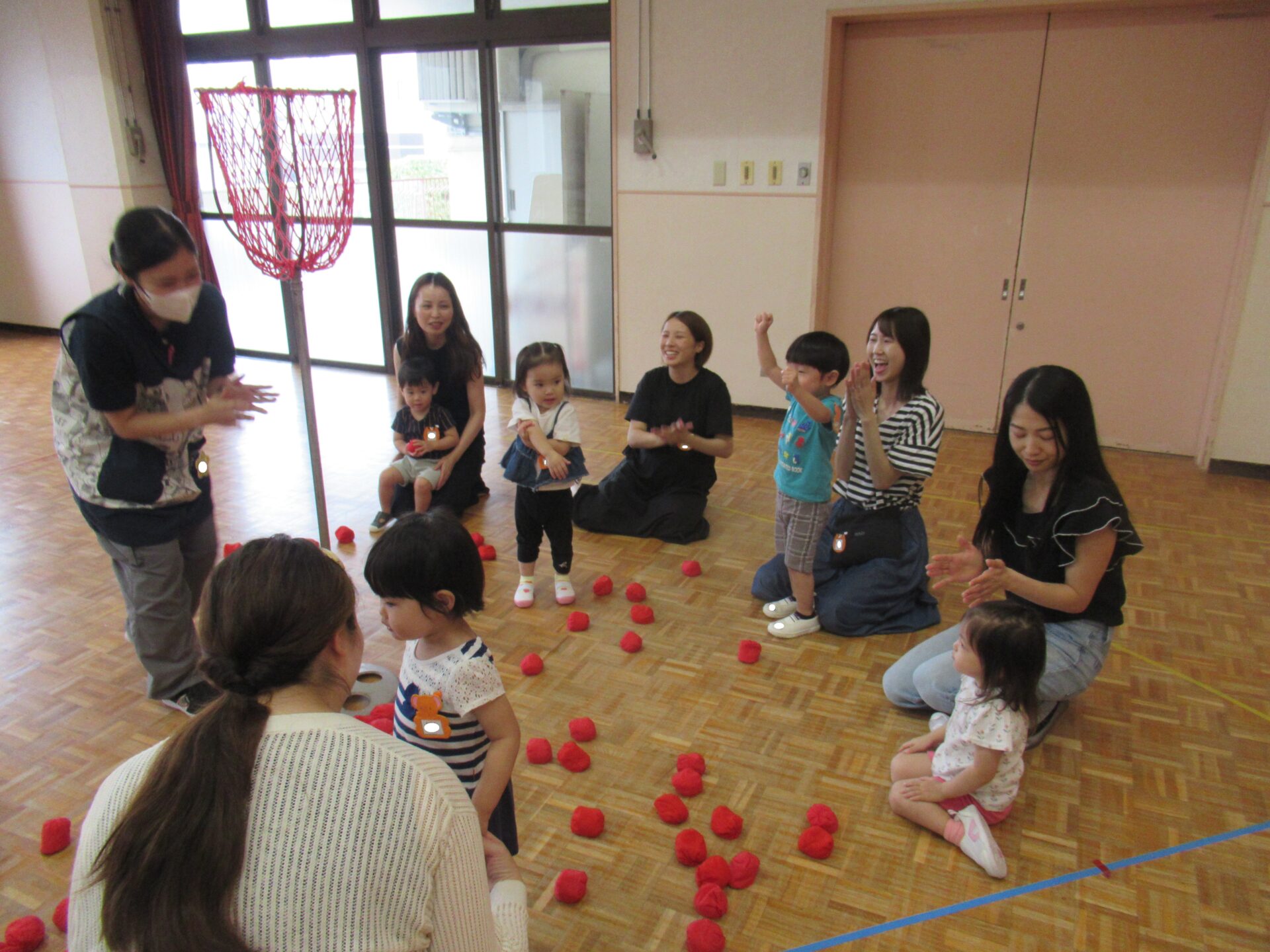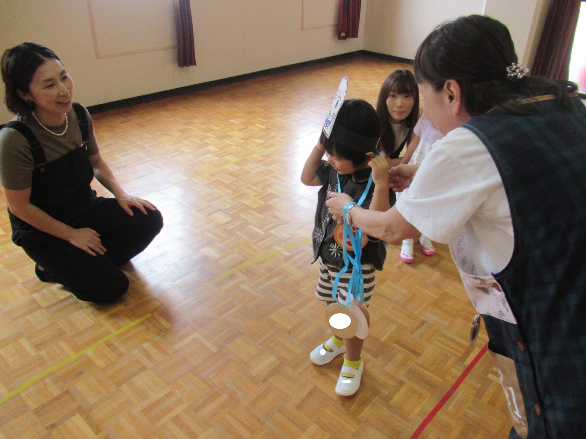 2025年度、最後のにこちゃんクラブは、AコースとBコース共にホールで運動会ごっこを開催しました♪ 最初はホールでお面作り、好きなキャラクターのお面に色を塗り素敵なお面が出来ました(^^) 最初は、サンサン体操を踊りました‼ 次は、玉入れを行いました♪ 年長組チームと、にこちゃんチームで玉入れを行った結果は‥。 にこちゃんチームの勝ちです✨ 最後は、先生が持っているタンバリン目掛けて、かけっこです💨(≧▽≦) ご褒美にメダルと🏅お土産をもらって、お帰りの時間です(>_<) 今年最後の、にこちゃんクラブでしたが、毎回参加して頂き本当にありがとうございました‼
