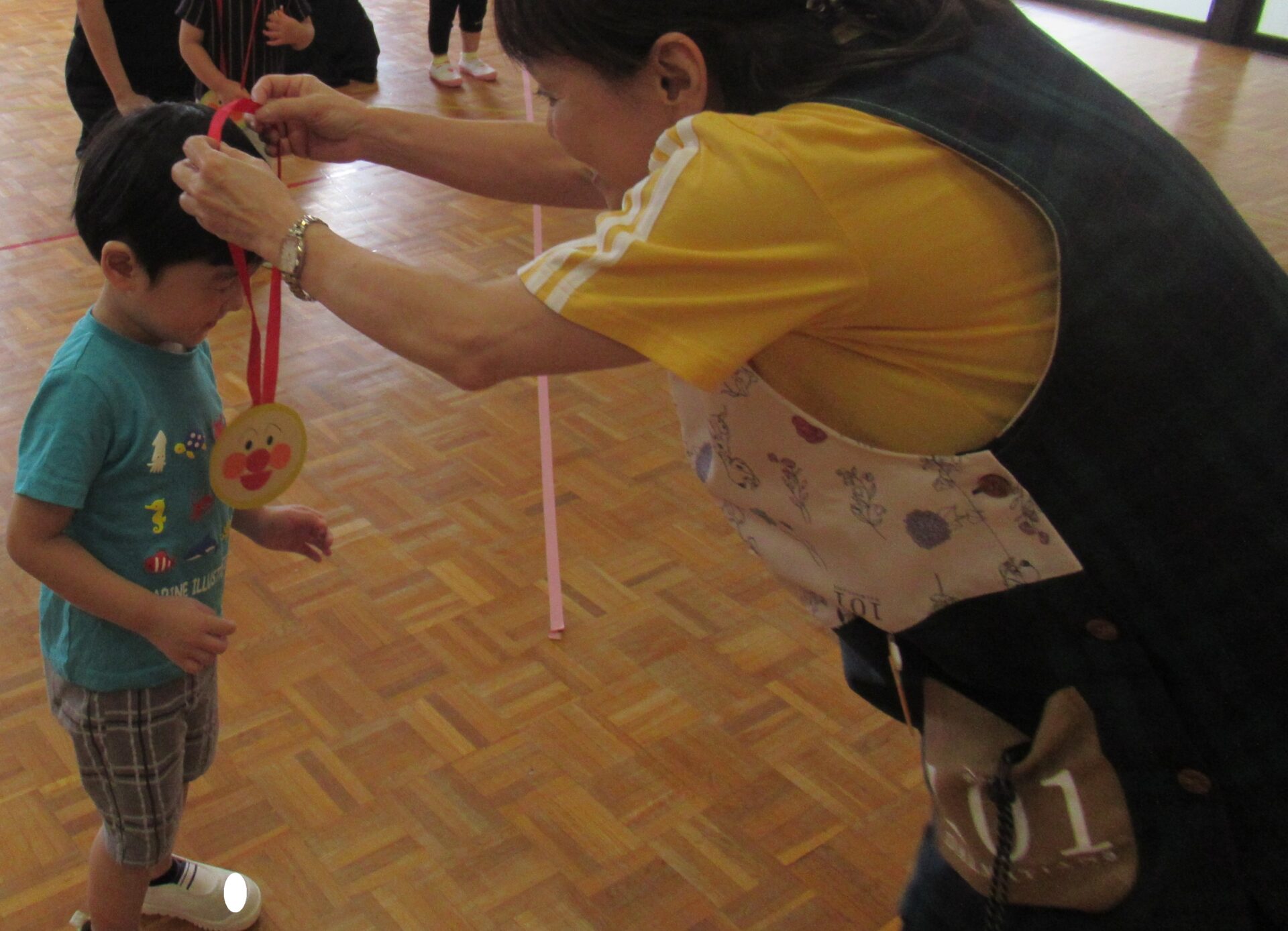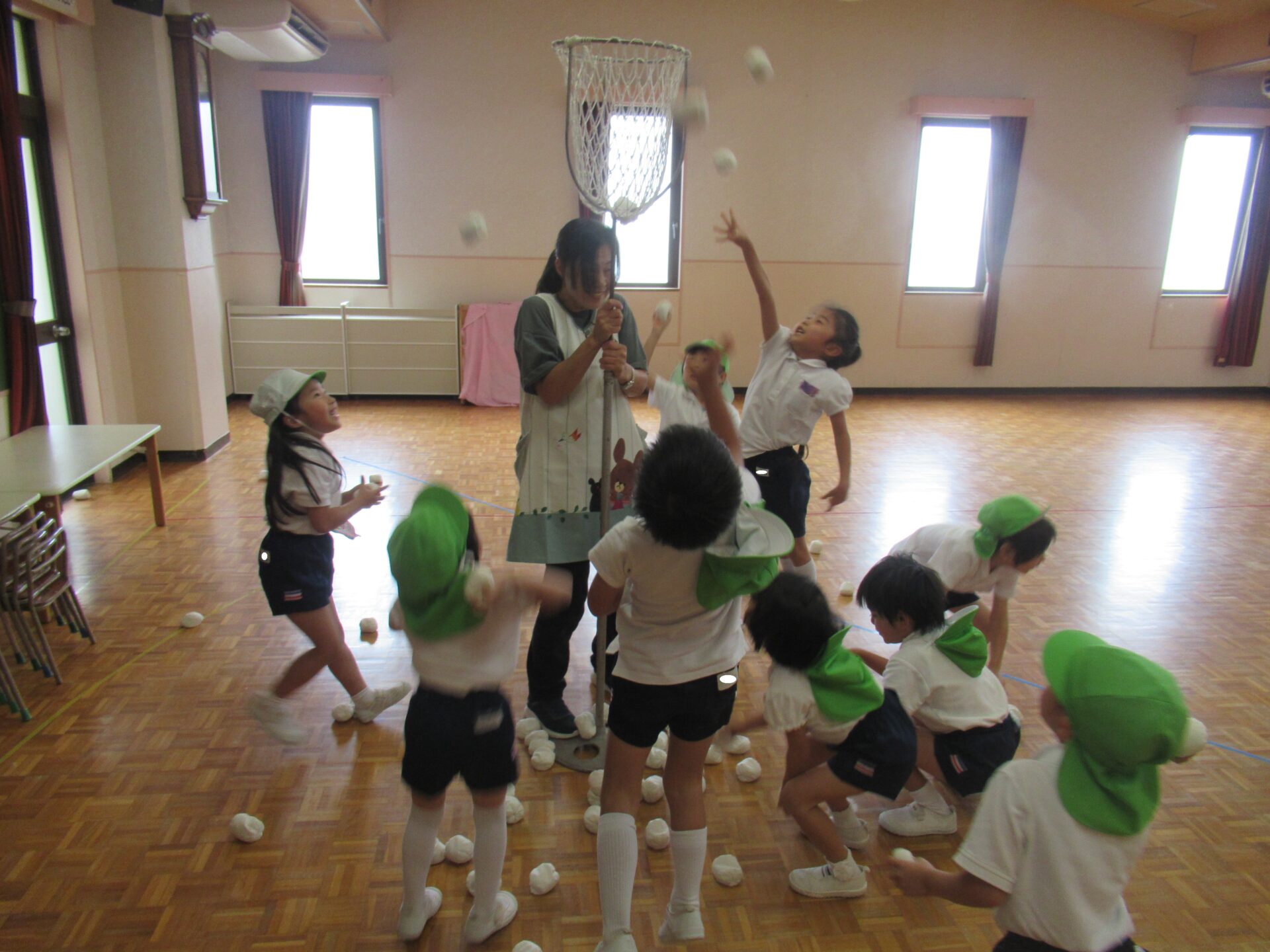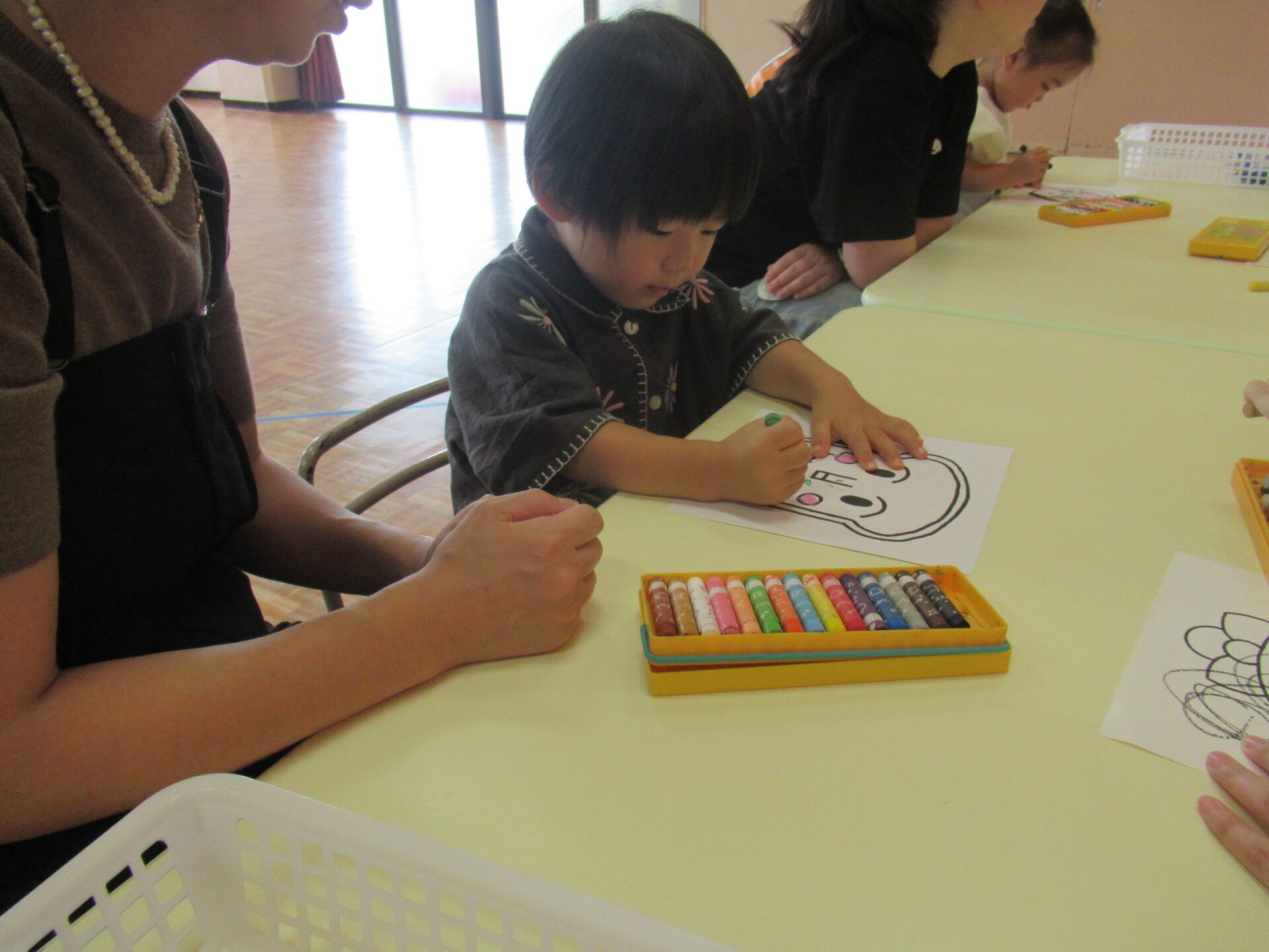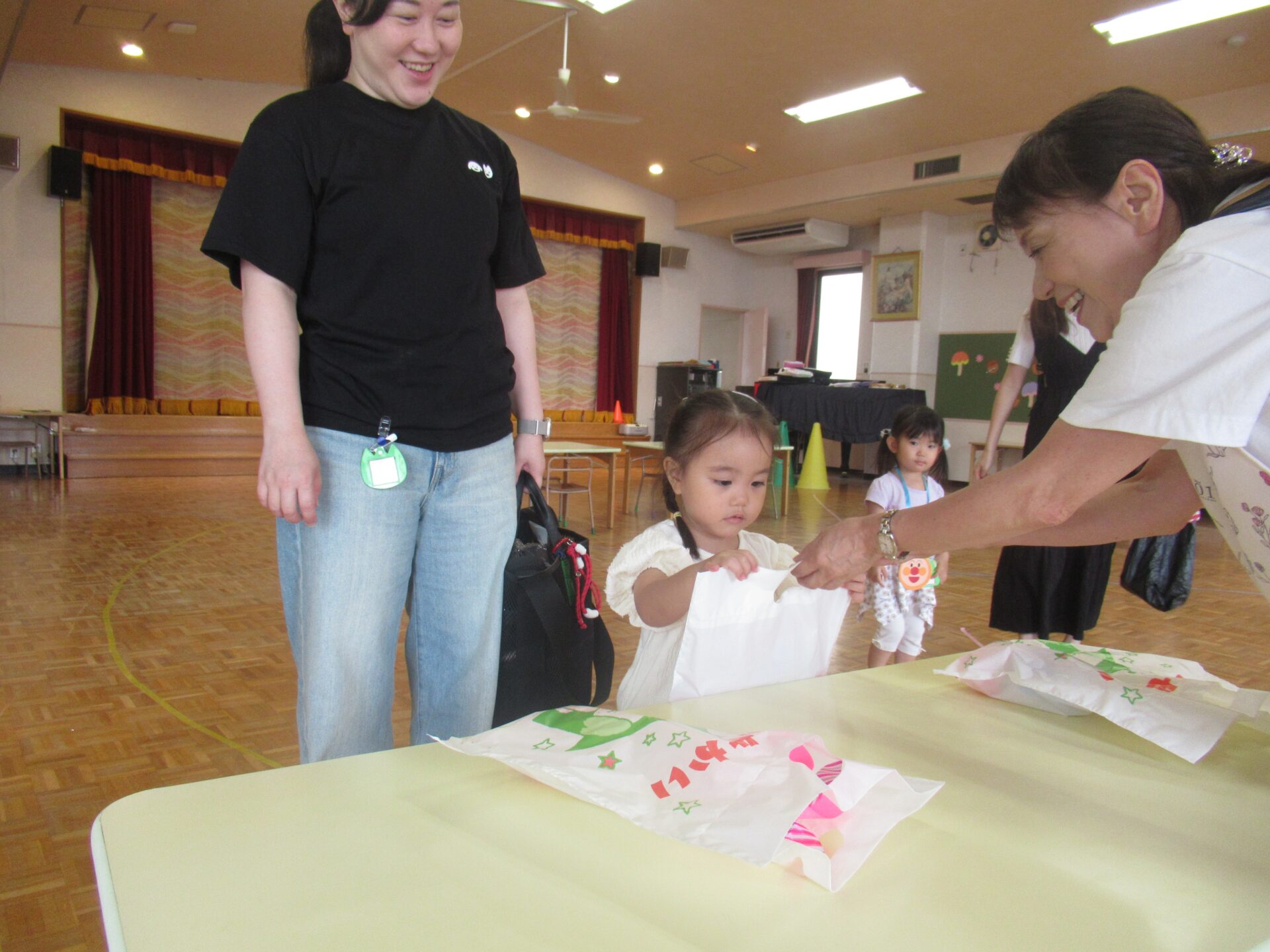 2025年度、最後のにこちゃんクラブは、AコースとBコース共にホールで運動会ごっこを開催しました♪ 最初はホールでお面作り、好きなキャラクターのお面に色を塗り素敵なお面が出来ました(^^) 最初は、サンサン体操を踊りました‼ 次は、玉入れを行いました♪ 年長組チームと、にこちゃんチームで玉入れを行った結果は‥。 にこちゃんチームの勝ちです✨ 最後は、先生が持っているタンバリン目掛けて、かけっこです💨(≧▽≦) ご褒美にメダルと🏅お土産をもらって、お帰りの時間です(>_<) 今年最後の、にこちゃんクラブでしたが、毎回参加して頂き本当にありがとうございました‼