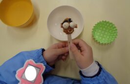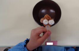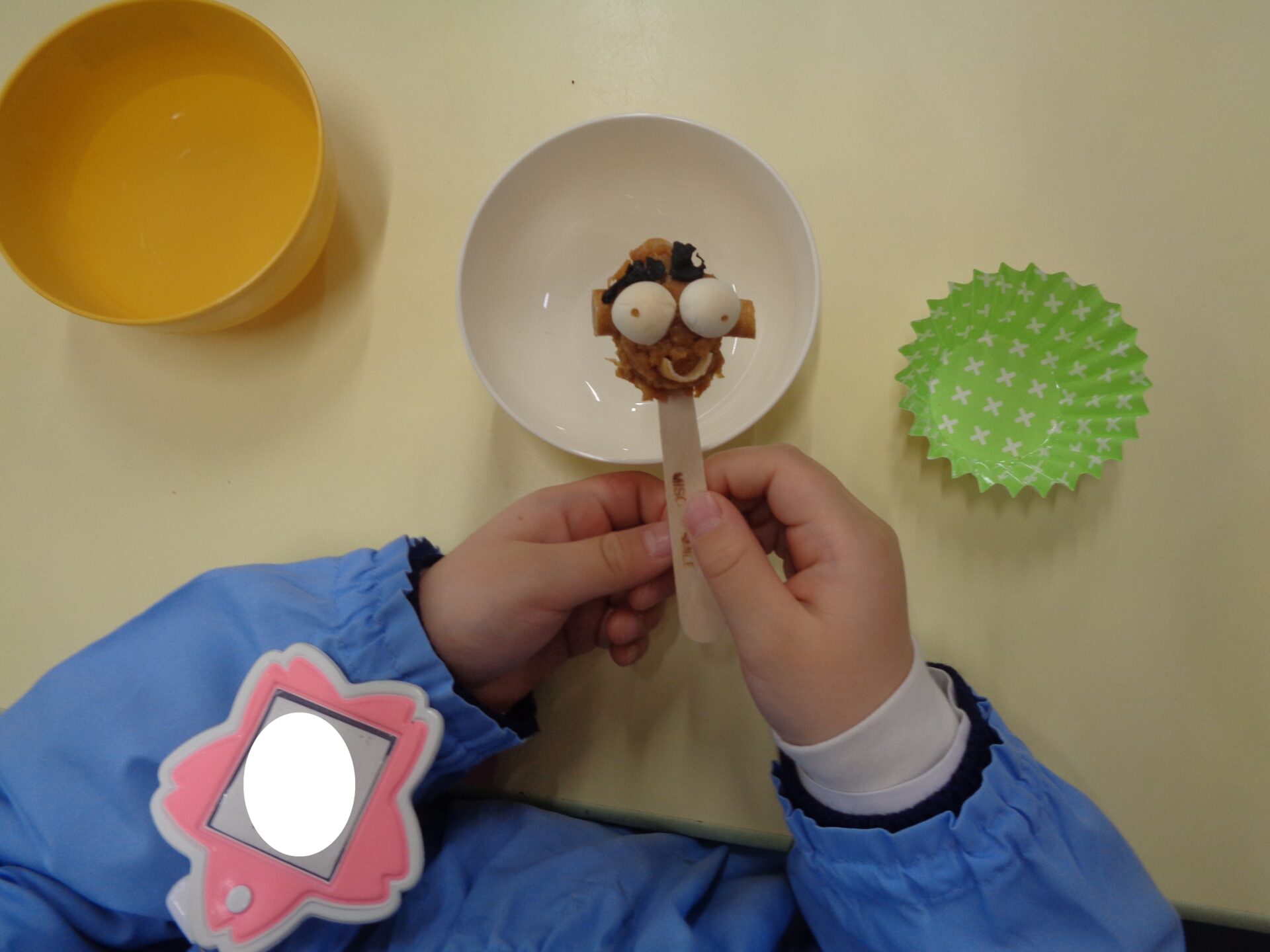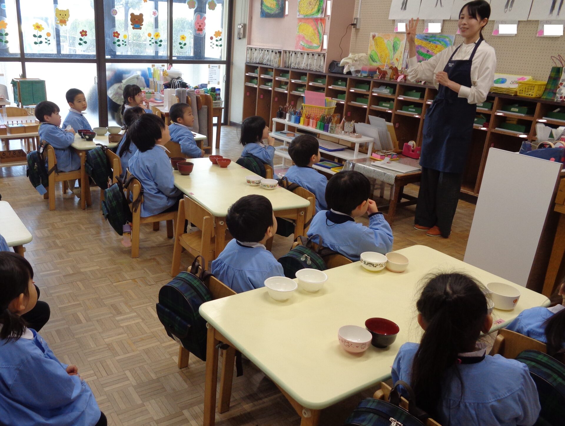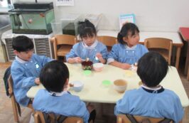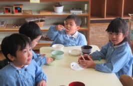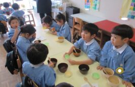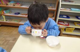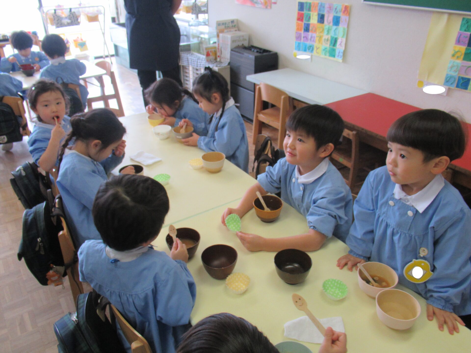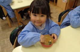 ただ味噌汁を飲むだけでなく、スプーンの上に味噌を乗せ、麩・ワカメで「スマイル」の顔を作り、そっと溶かしながら飲むという、楽しい活動を行いました。