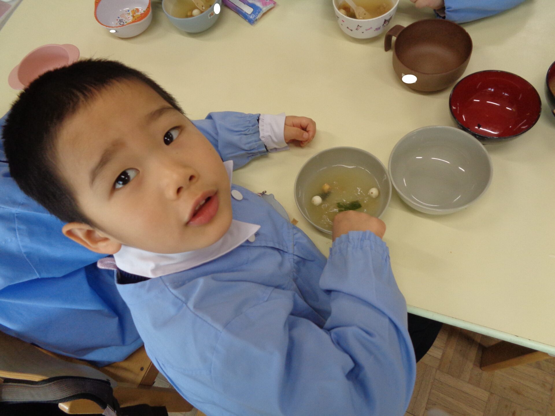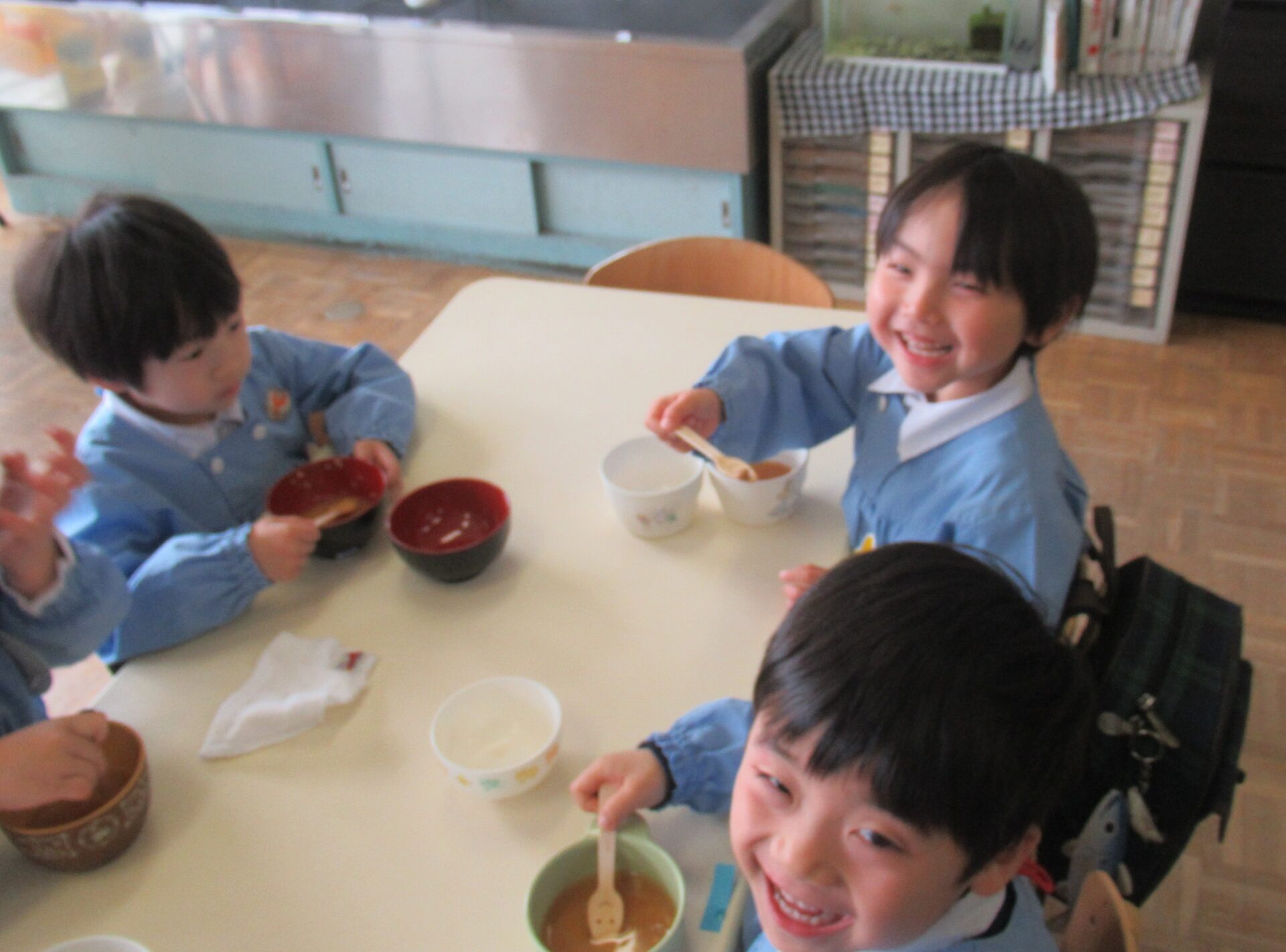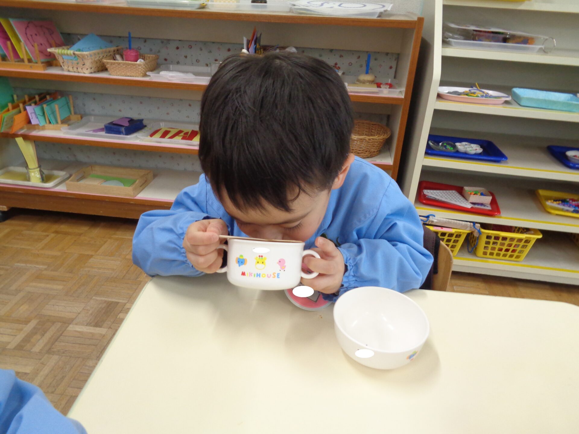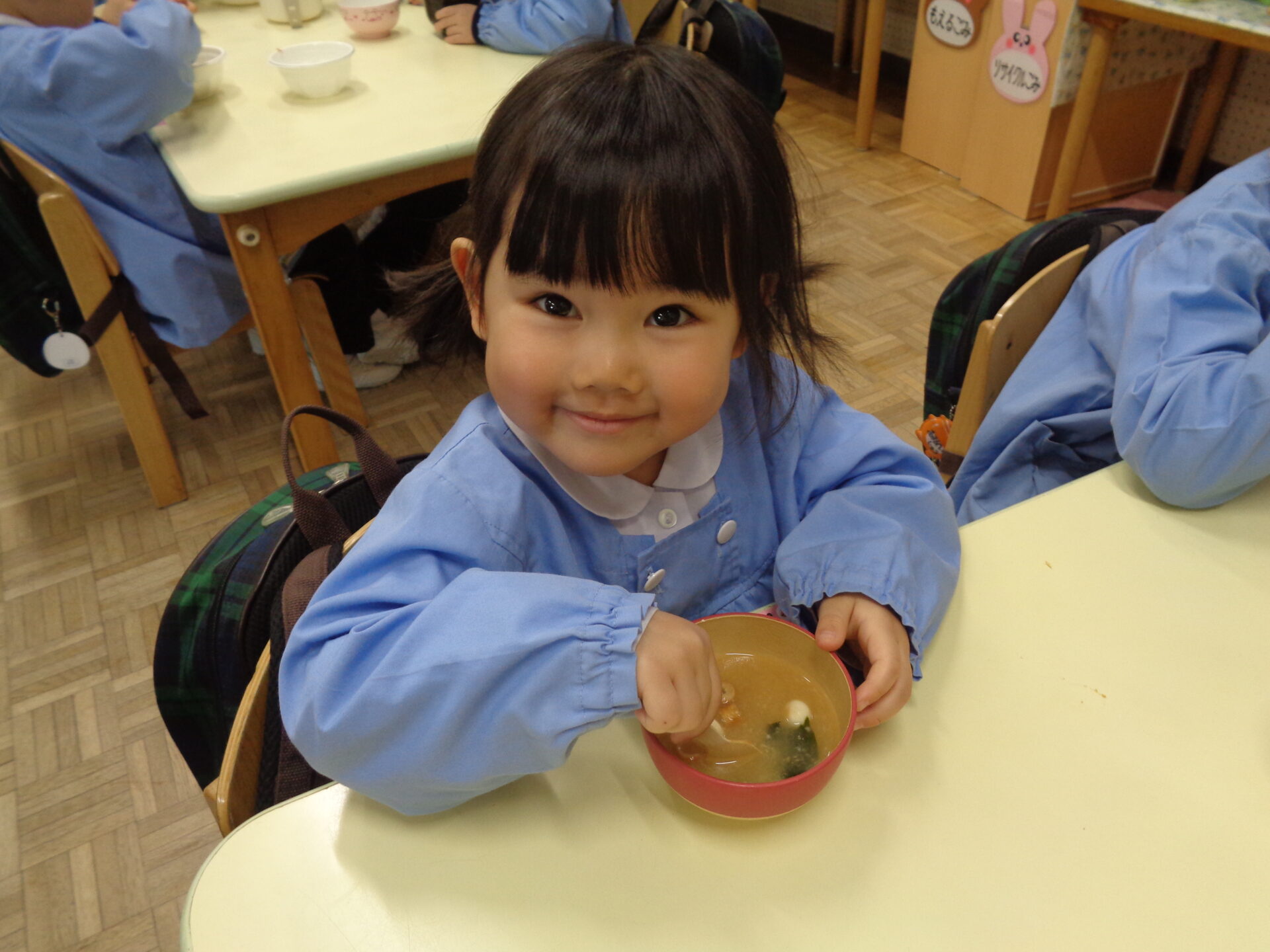 スプーンの上にかわいい笑顔を作り、「溶けていくよ!」「なくなっちゃった!」と、楽しみながら味噌汁を味わっていました!