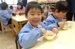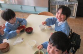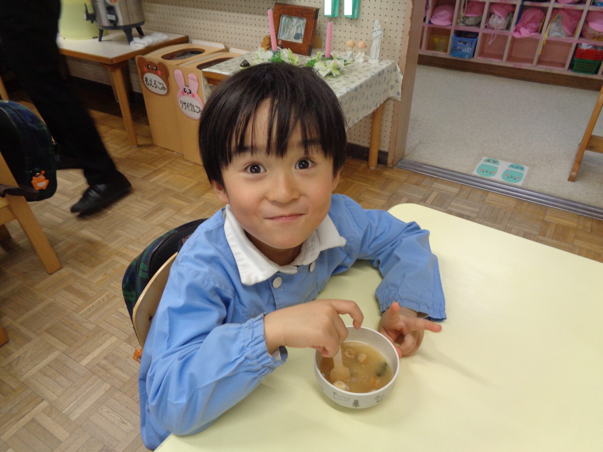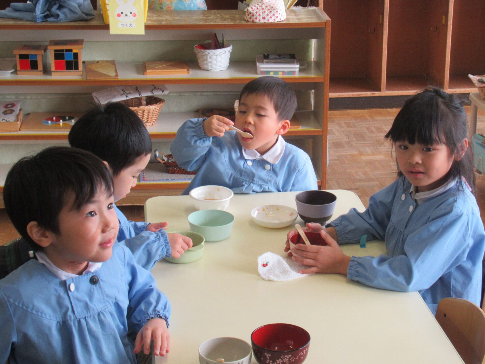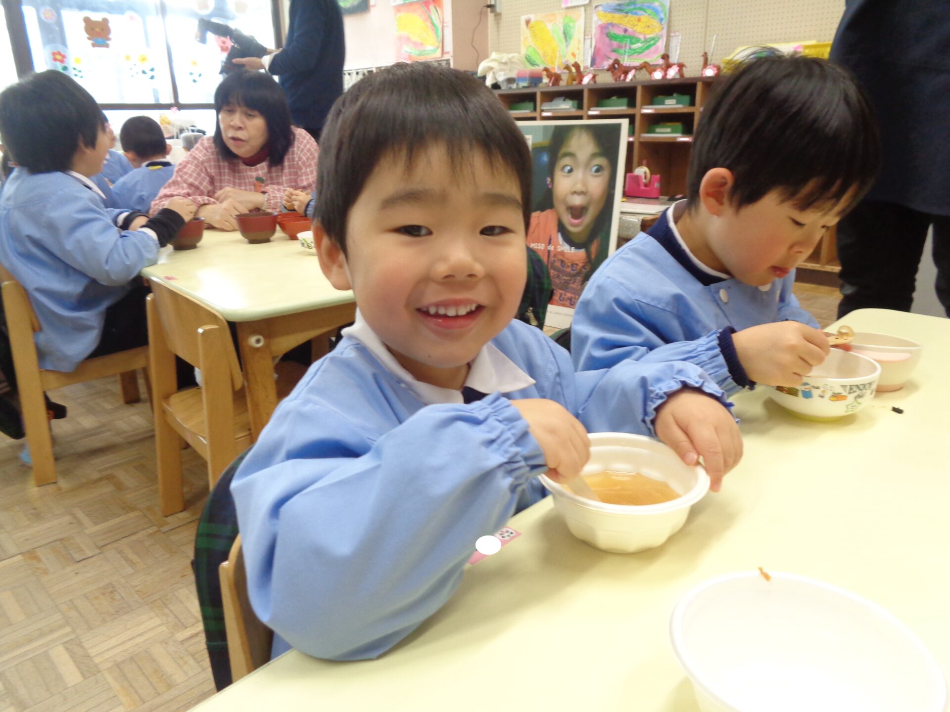 スプーンの上にかわいい笑顔を作り、「溶けていくよ!」「なくなっちゃった!」と、楽しみながら味噌汁を味わっていました!
