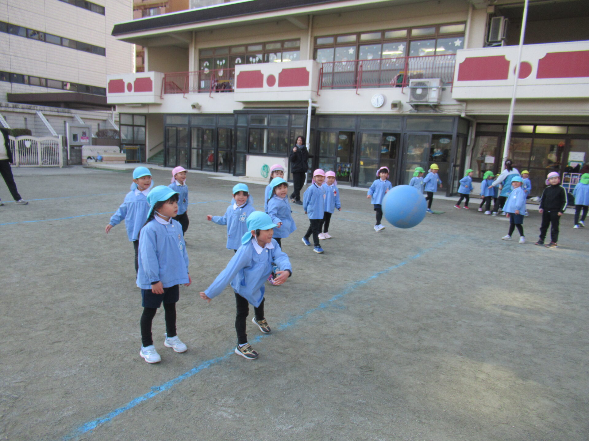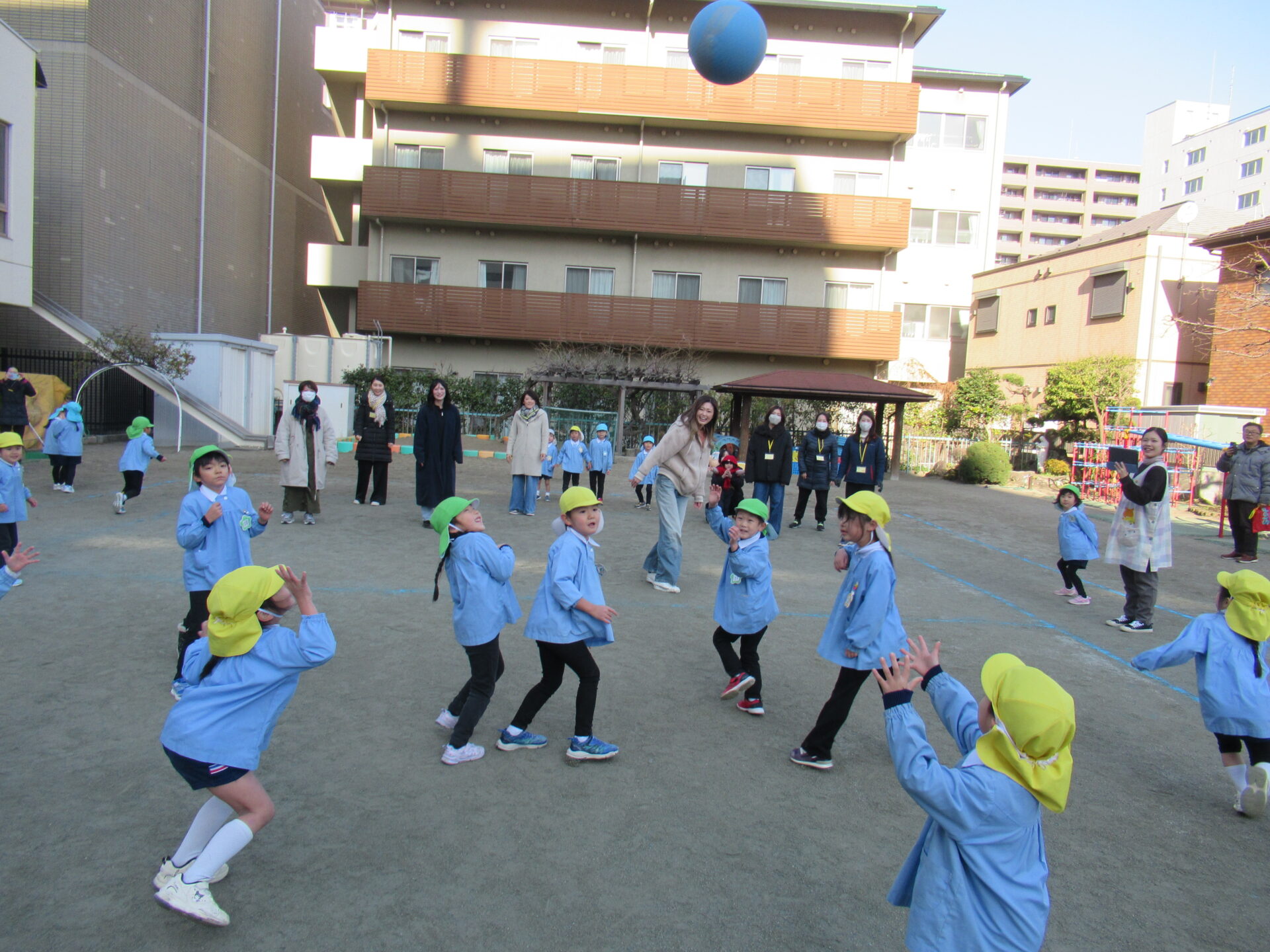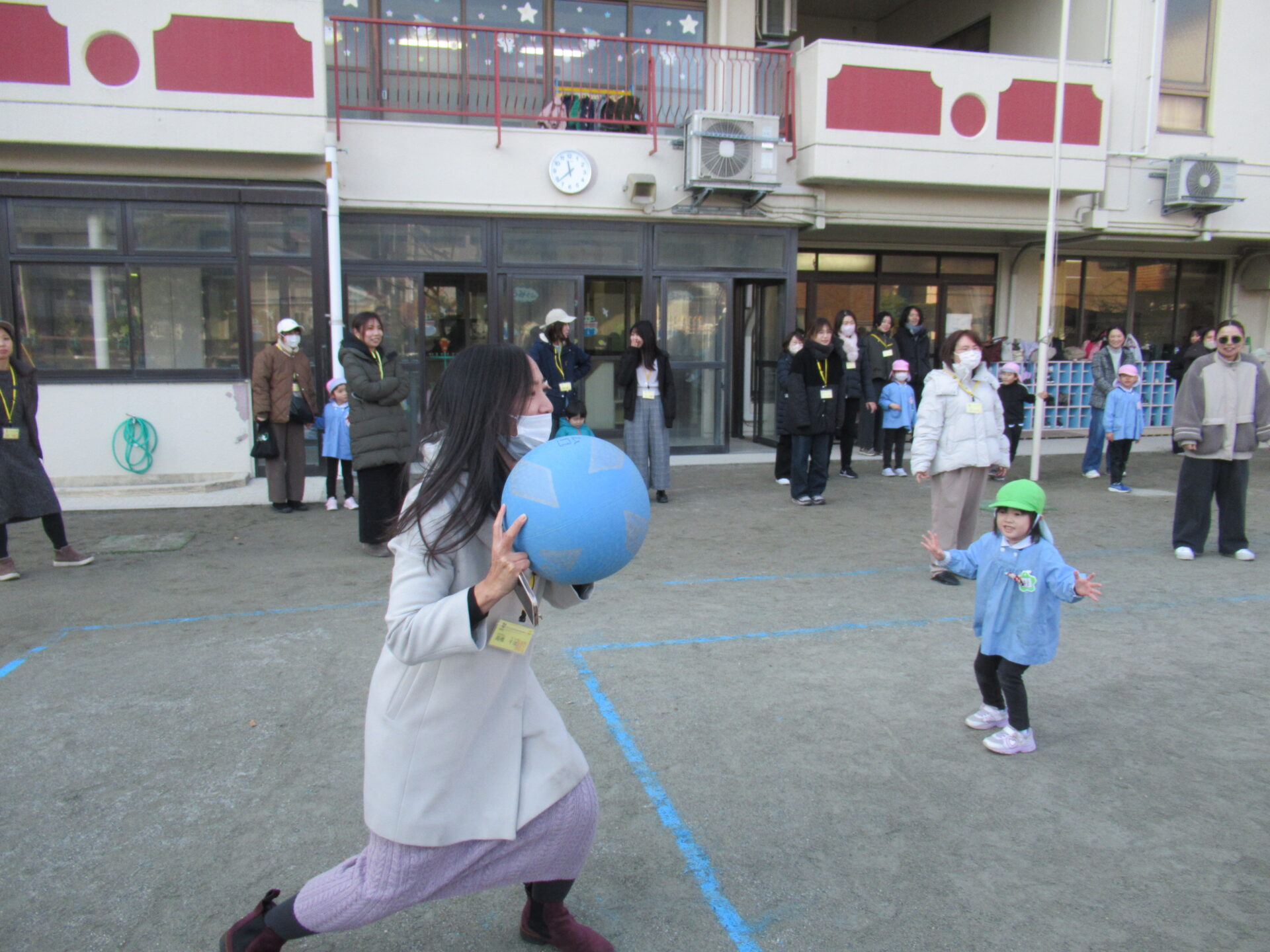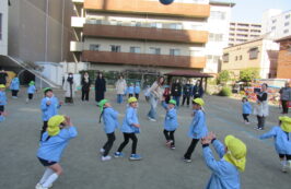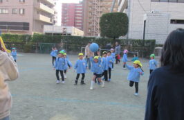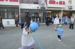 最近、年長児の間で流行っている『ドッチボール』を、大好きなお家の方と対戦しました。1回戦は、うみ組とはな組の子ども達対保護者の方で、2回戦目は、にじ組とほし組の子ども達対保護者の方で行いました。お母さま方も、子ども達の投げる球に当たって下さったり、盛り上げて下さったことで、楽しいひとときを過ごすことができました。