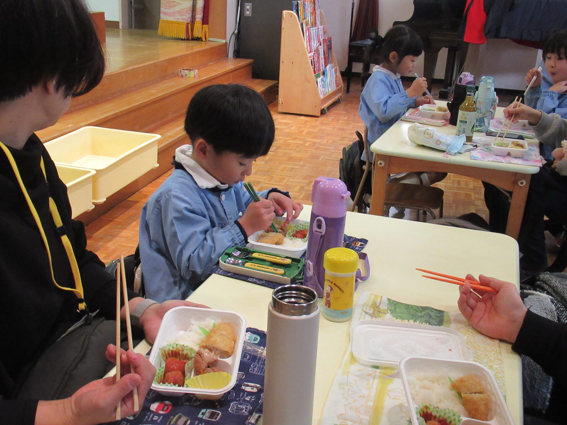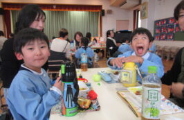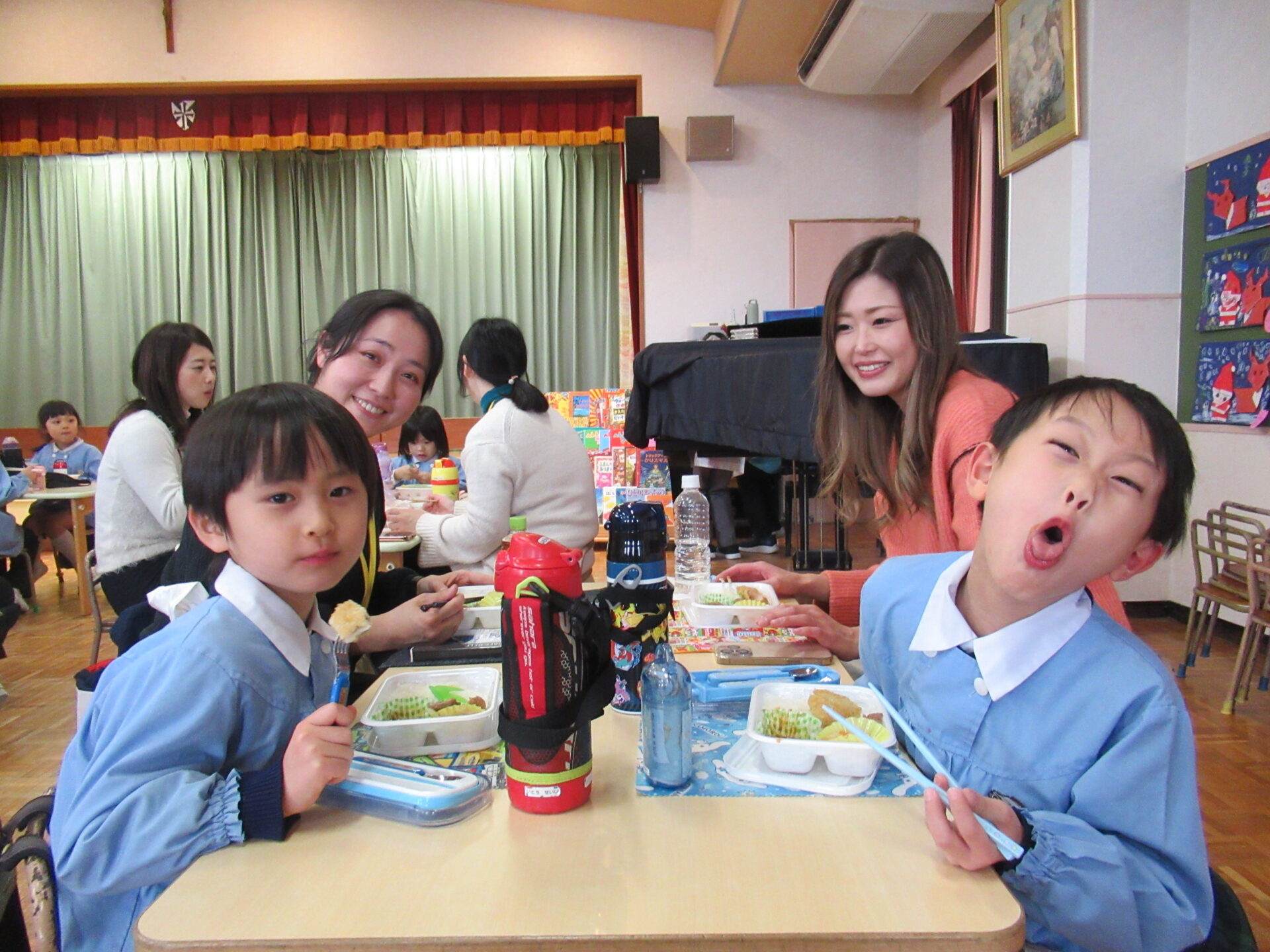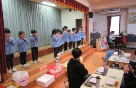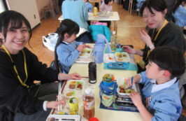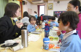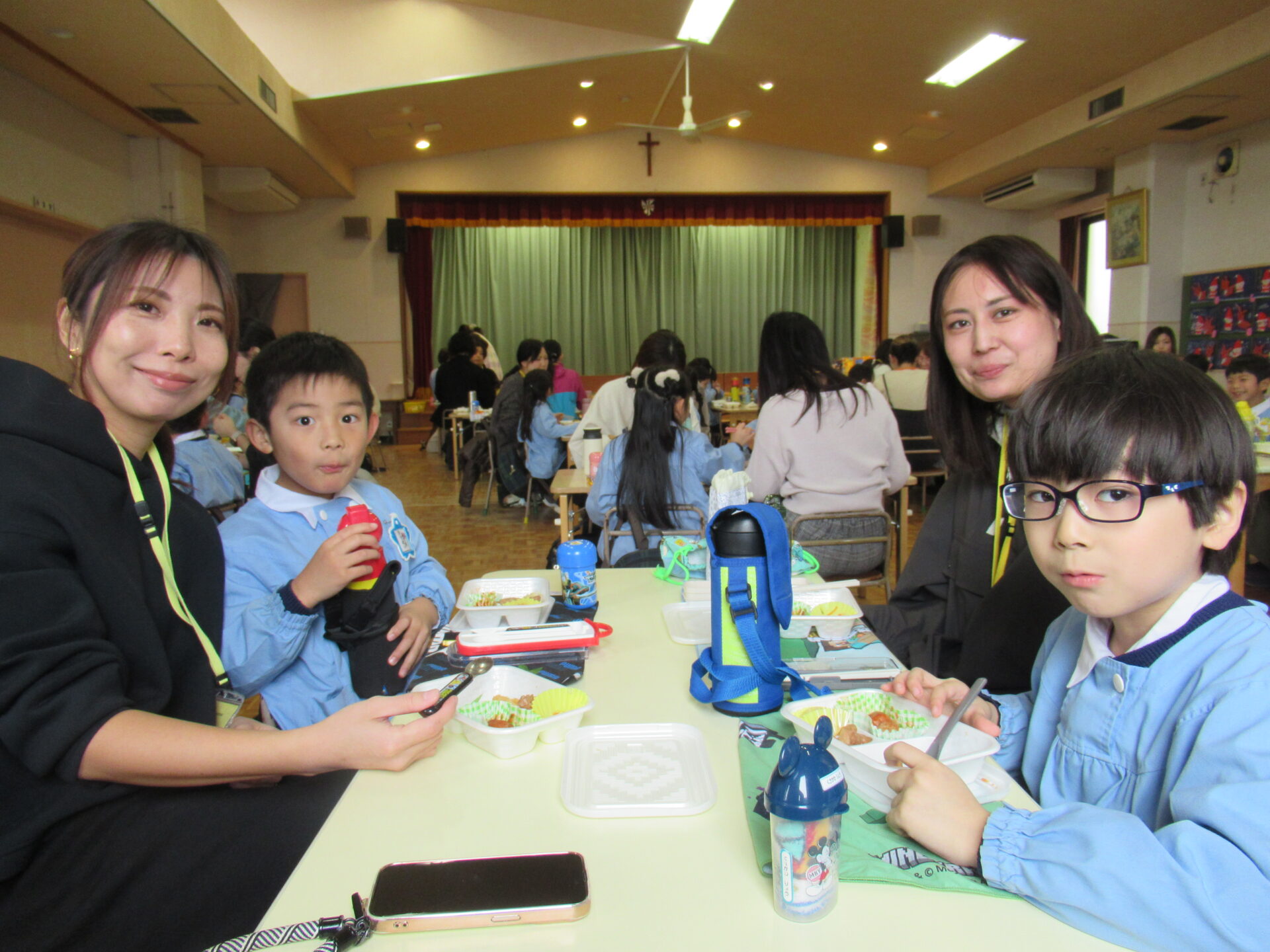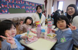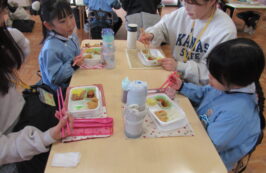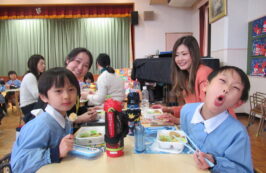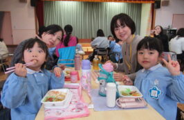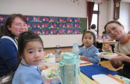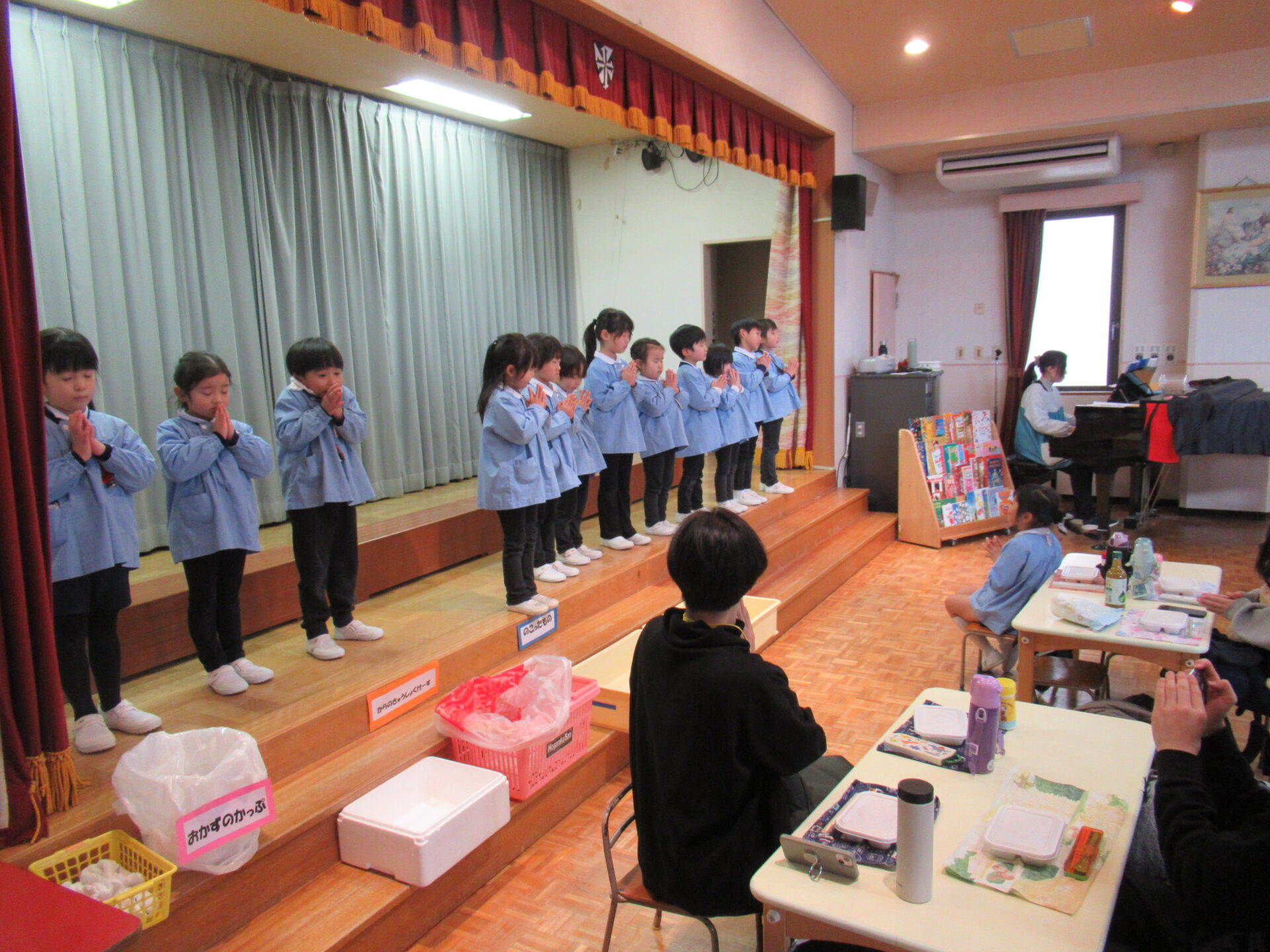 ドッチボールの後は、ホールに移動して、保護者の方と一緒に、給食を食べました。普段の『お当番活動』も見て頂き、給食を配って、お祈りはステージの上で披露しました。