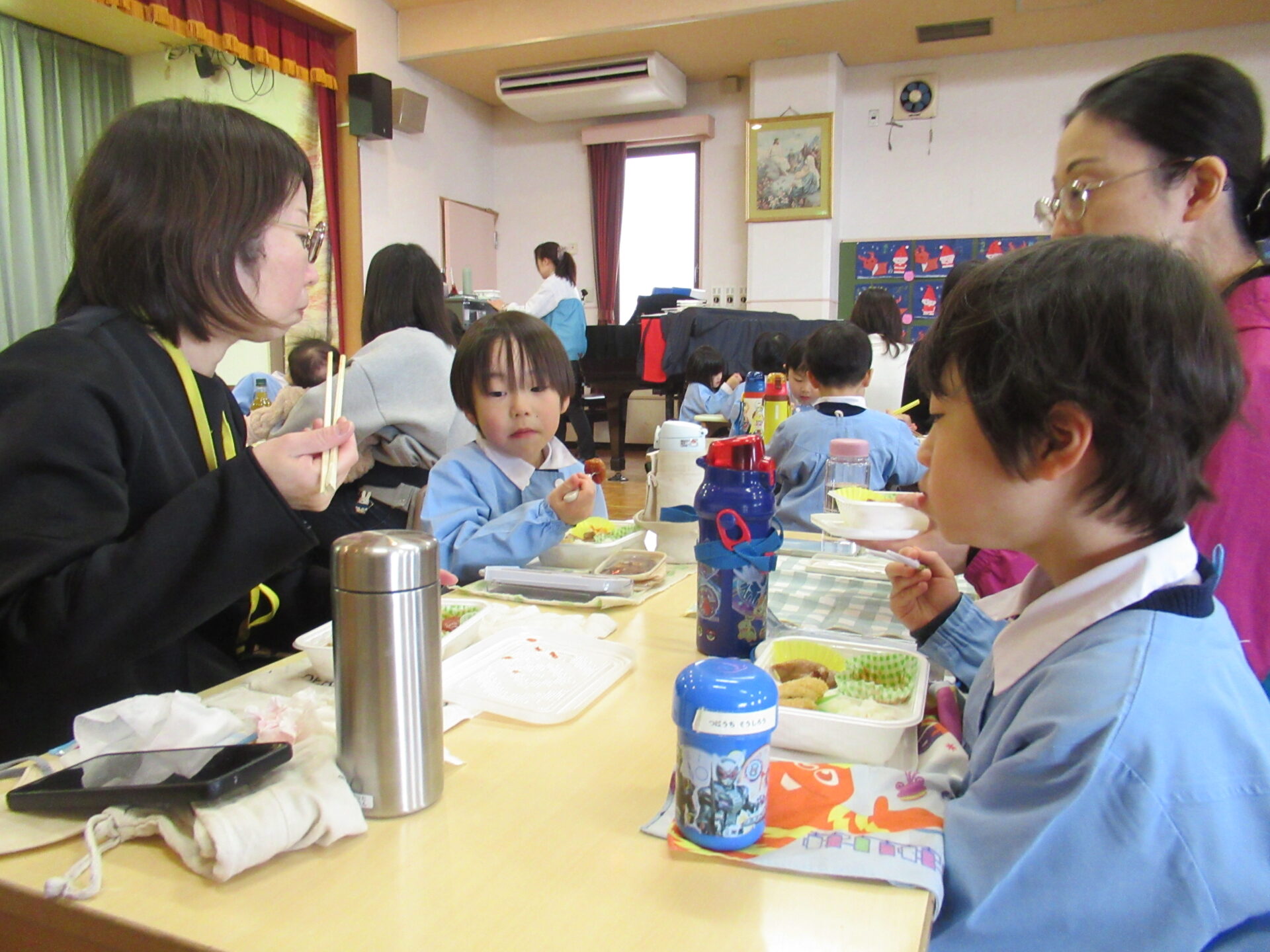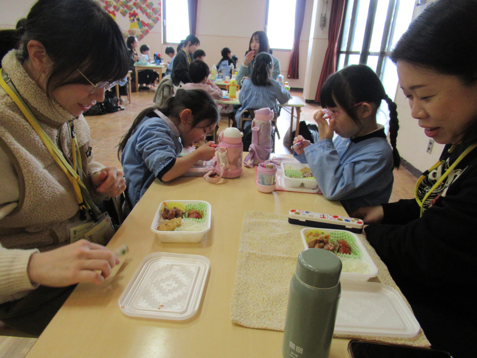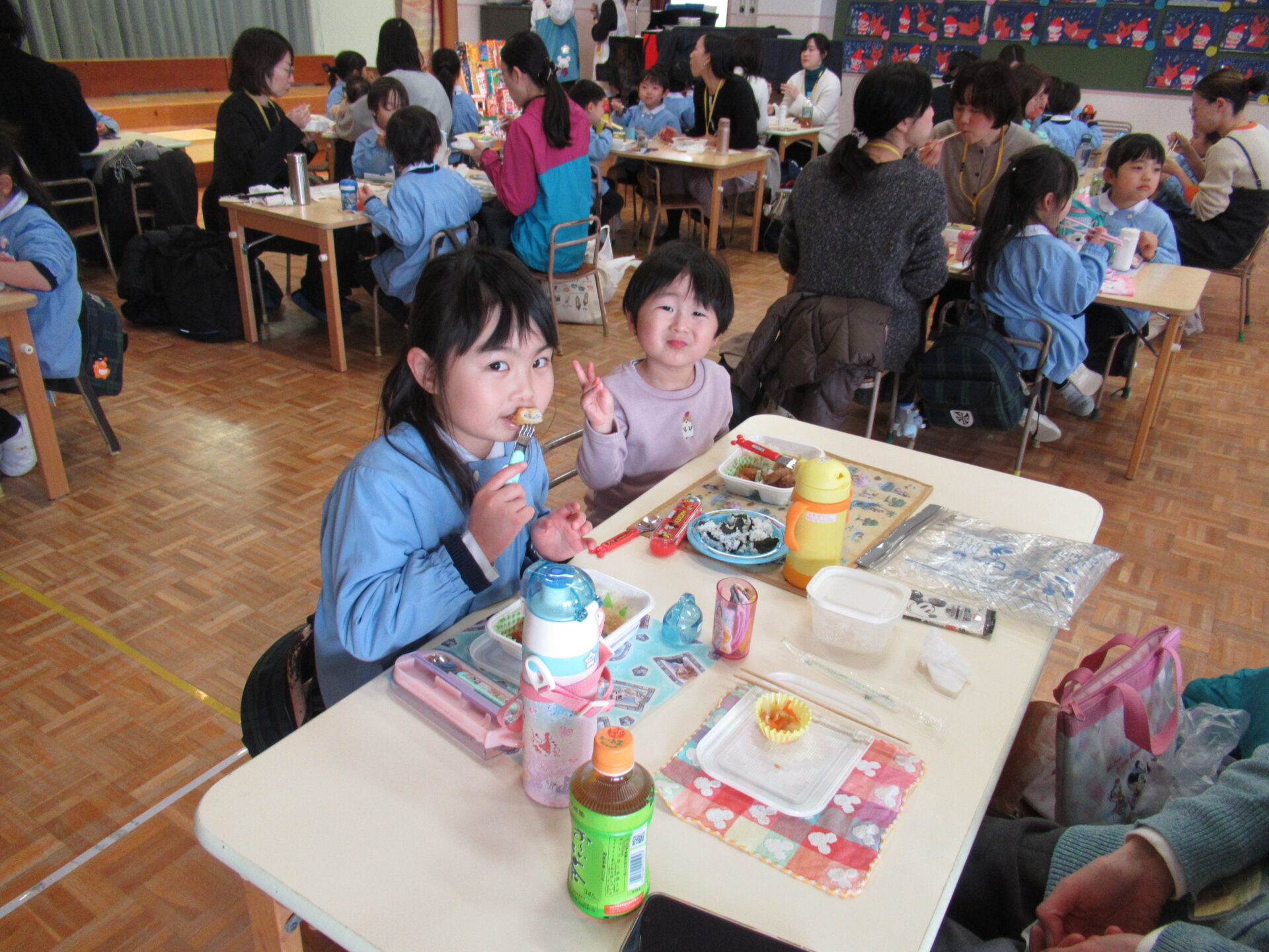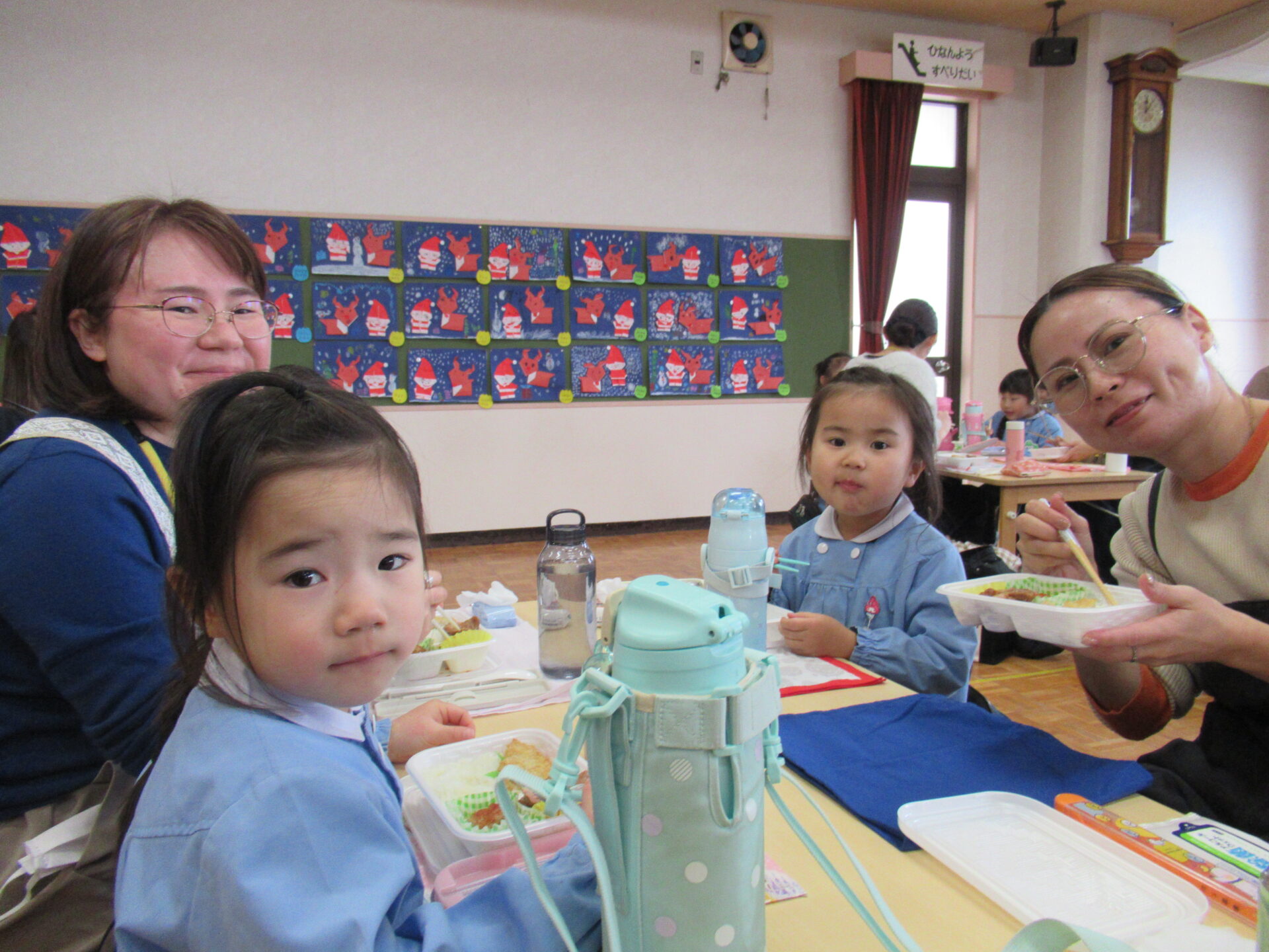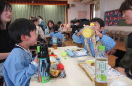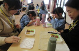 ドッチボールの後は、ホールに移動して、保護者の方と一緒に、給食を食べました。普段の『お当番活動』も見て頂き、給食を配って、お祈りはステージの上で披露しました。
