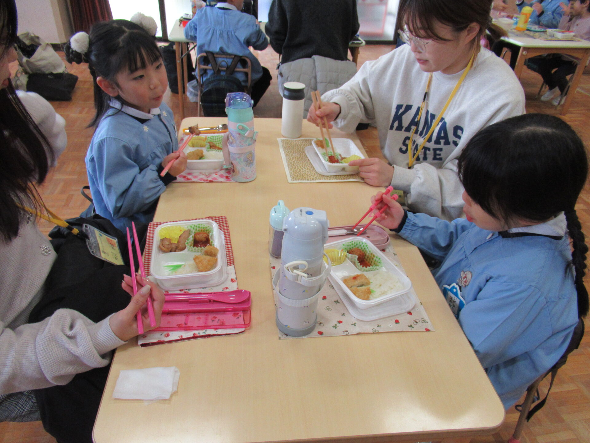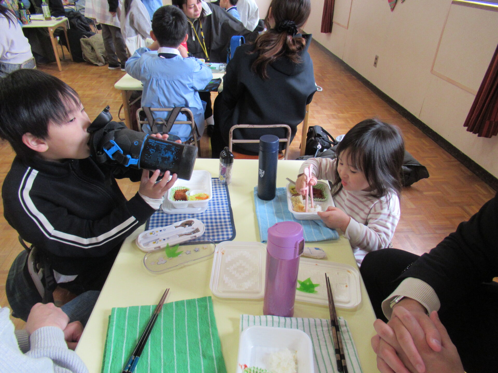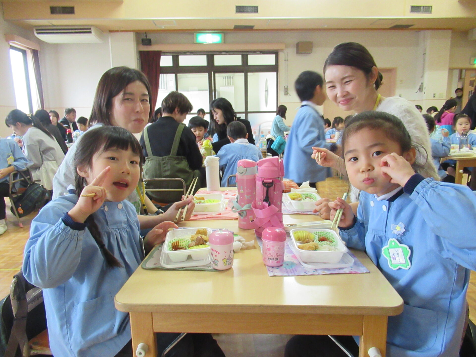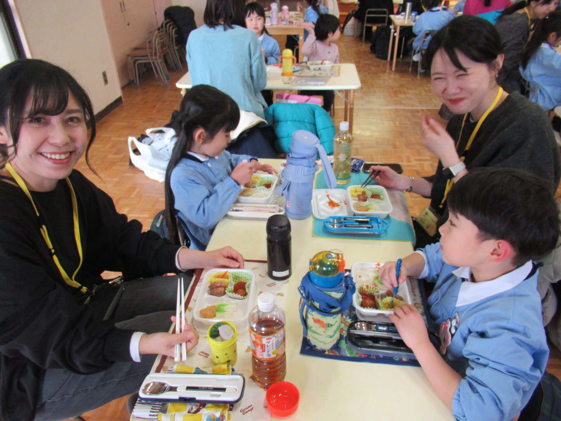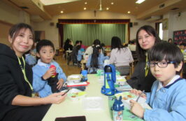 ドッチボールの後は、ホールに移動して、保護者の方と一緒に、給食を食べました。普段の『お当番活動』も見て頂き、給食を配って、お祈りはステージの上で披露しました。