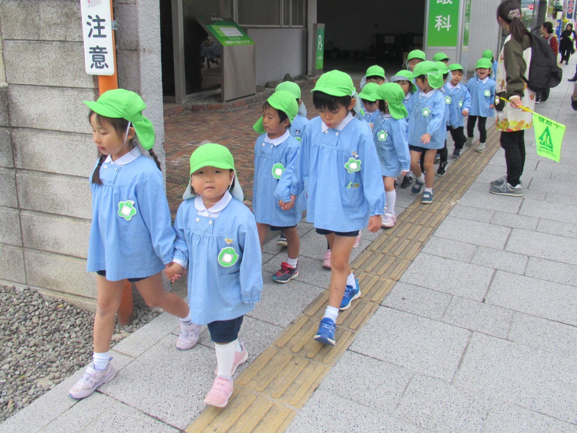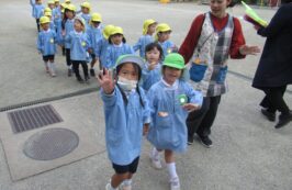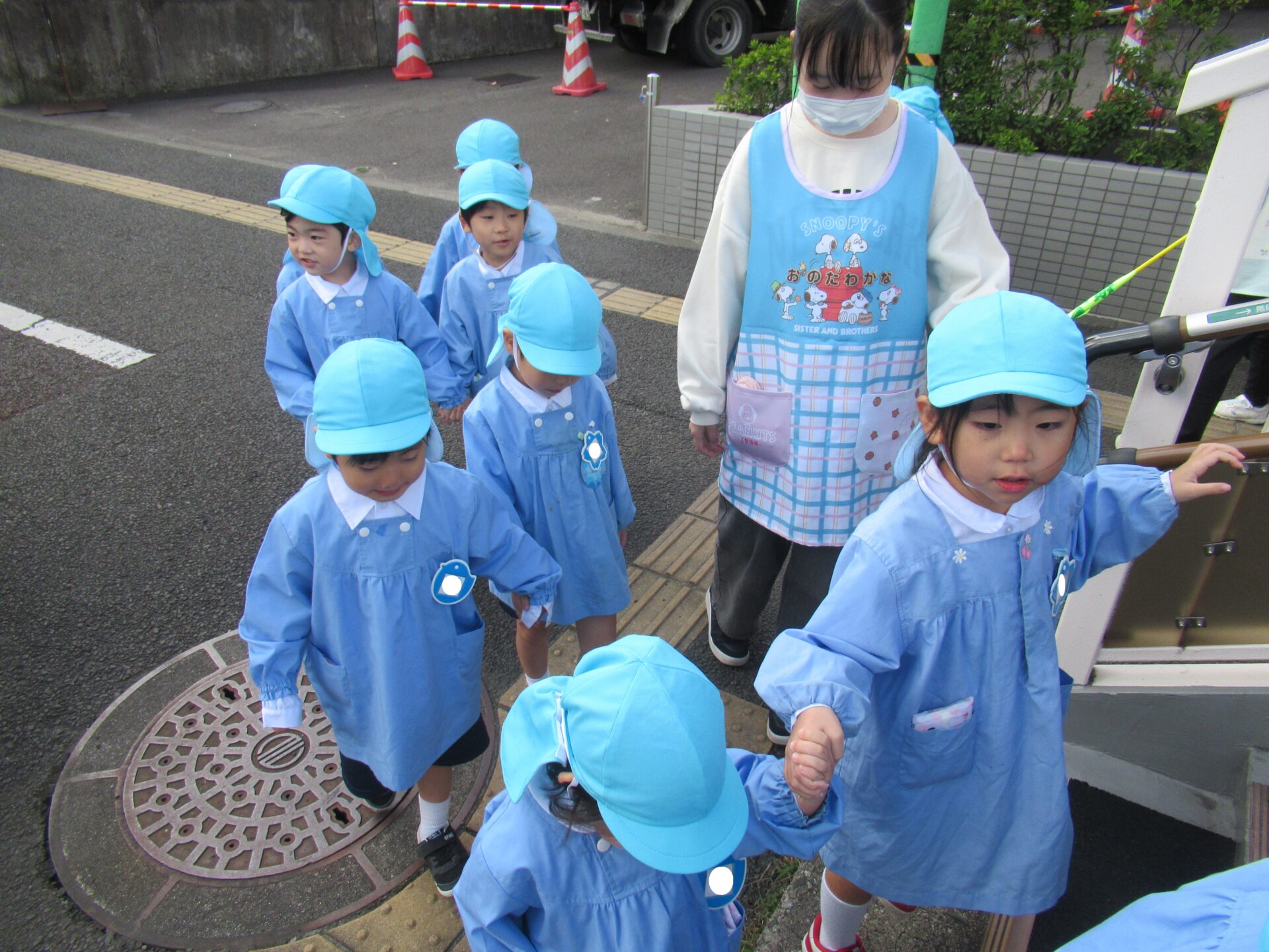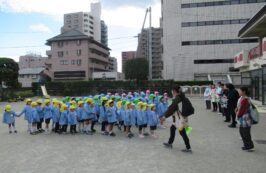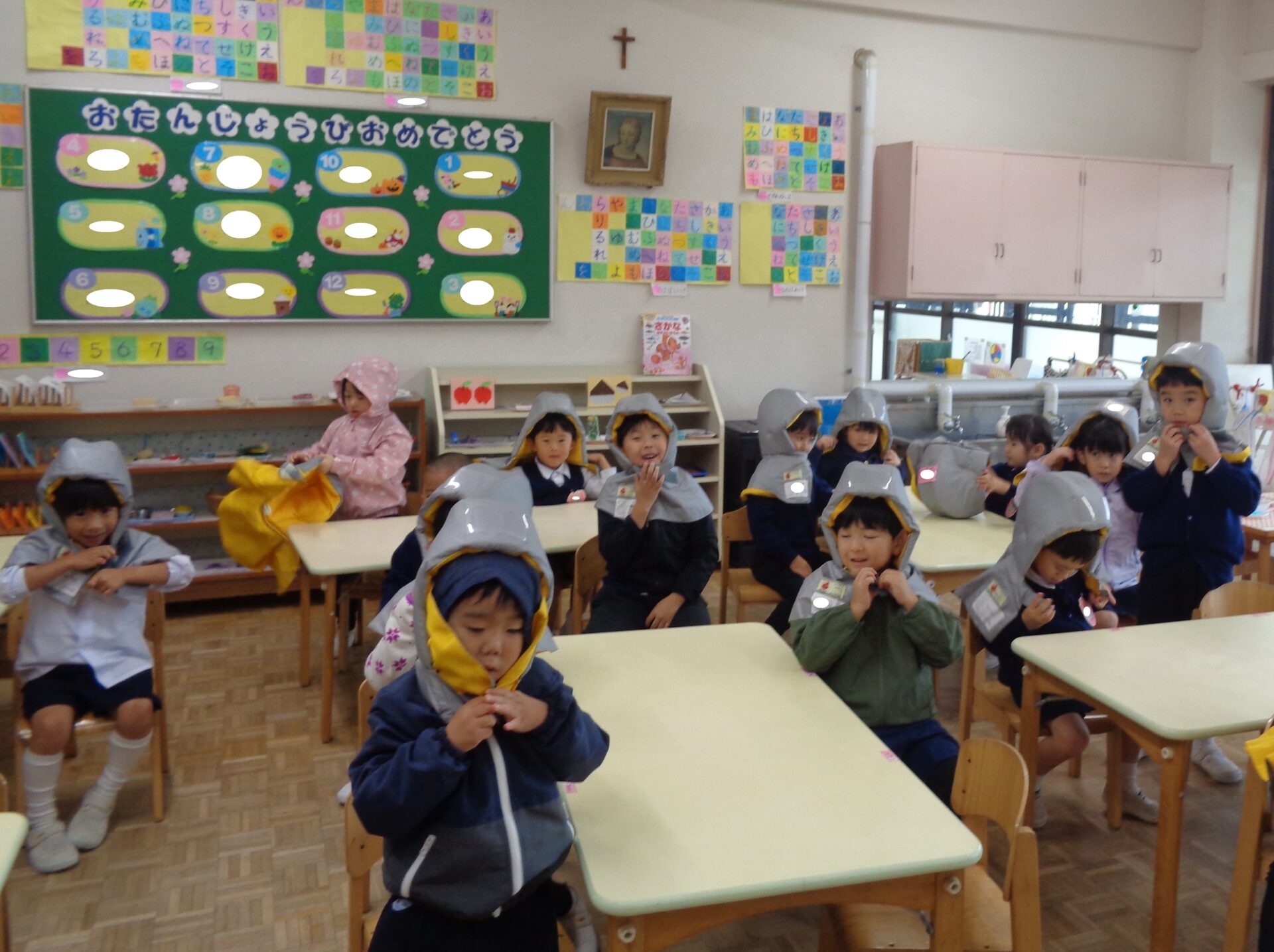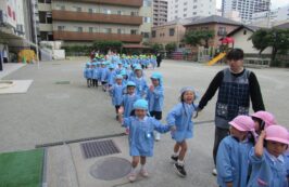 お友達としっかり手をつないで、園に戻ります! 上手に避難の練習を、することができましたね!! 園に到着後、防災頭巾の被り方の練習をしました! 皆さん、頑張りましたね👏