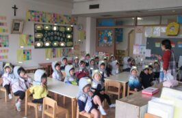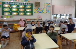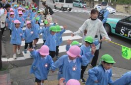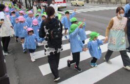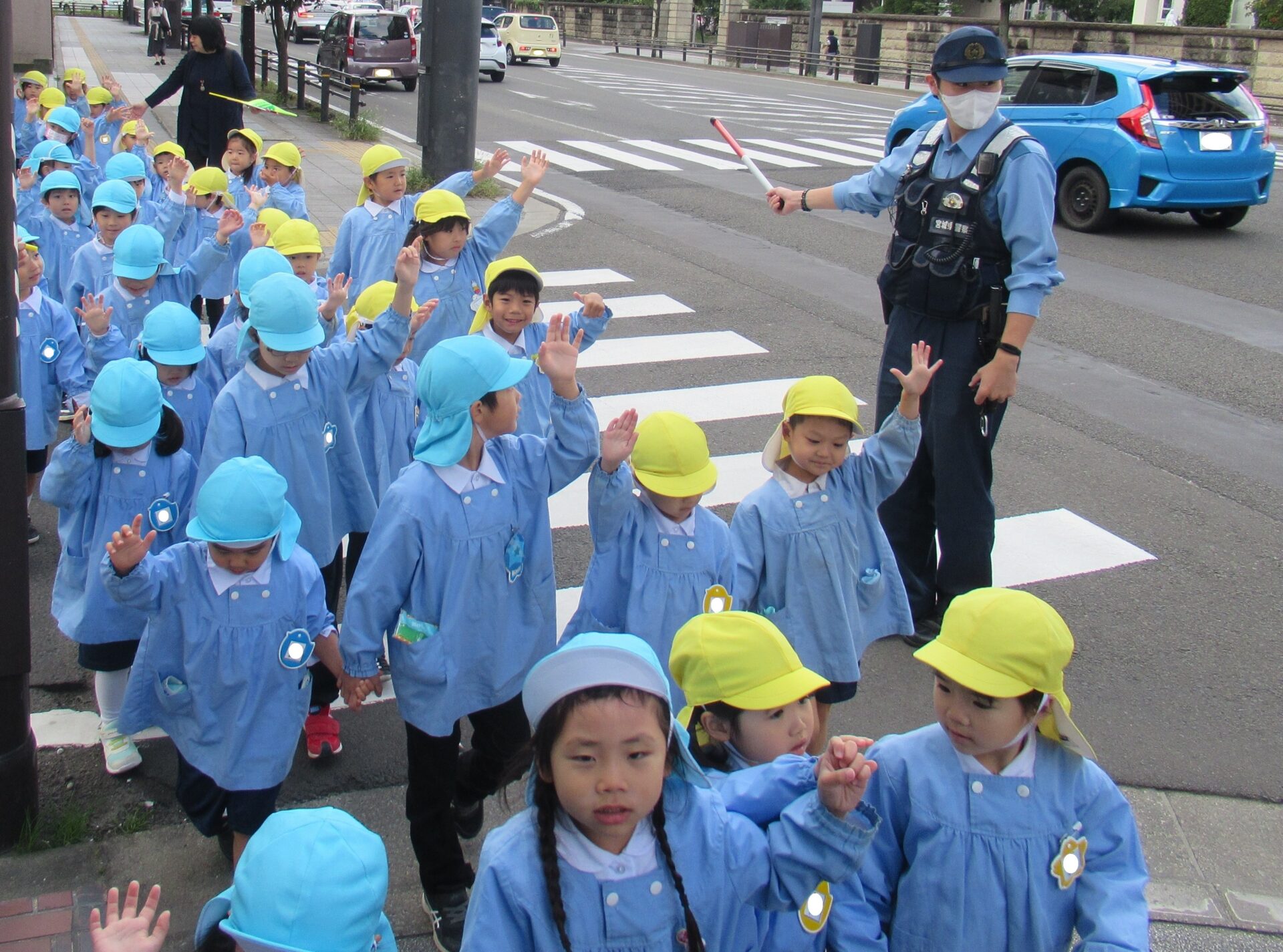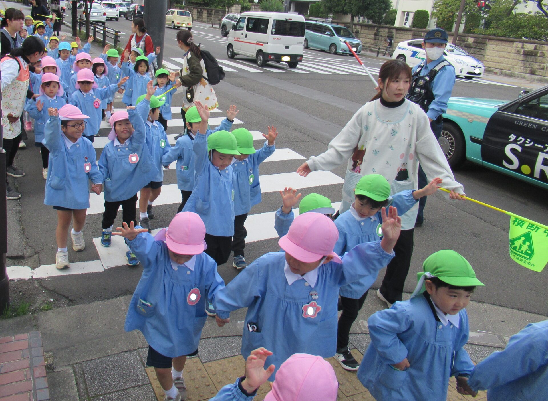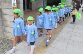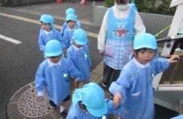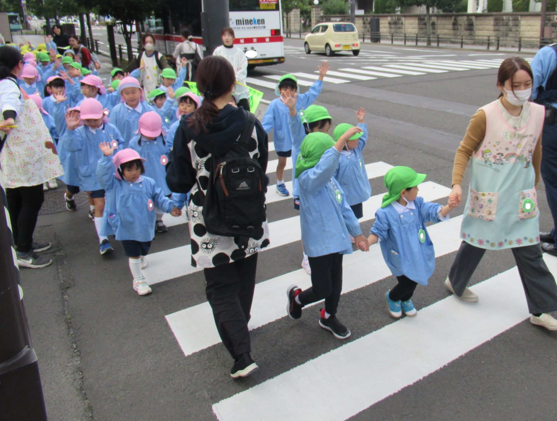 お友達としっかり手をつないで、園に戻ります! 上手に避難の練習を、することができましたね!! 園に到着後、防災頭巾の被り方の練習をしました! 皆さん、頑張りましたね👏