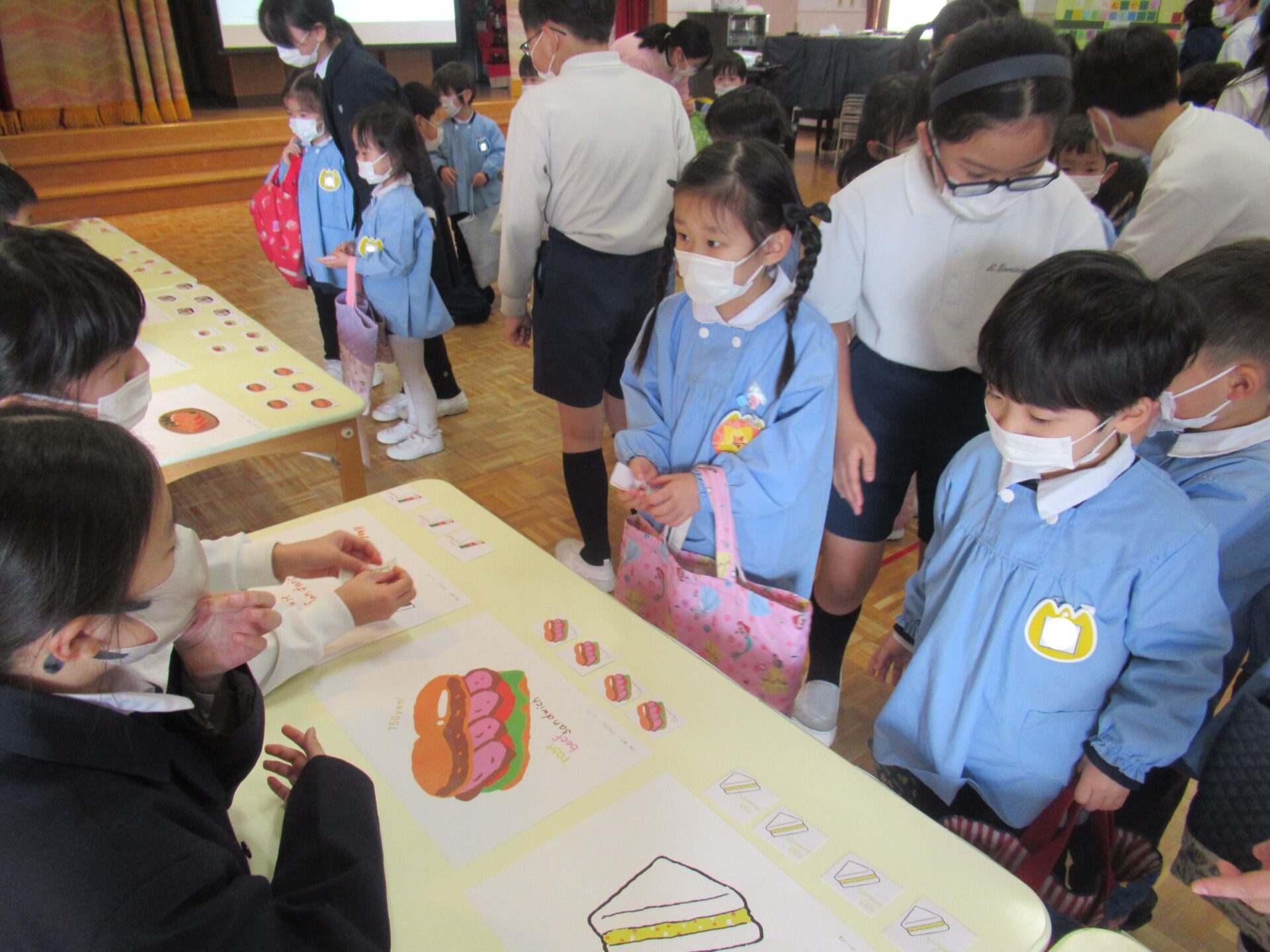 ハンバーガーやさん・飲み物やさん・スイーツやさんなど盛りだくさん!!お兄さん・お姉さんと一緒にお店をまわって、お買い物をしました。